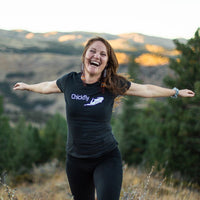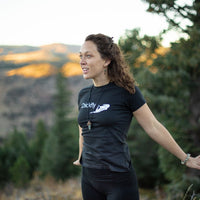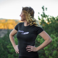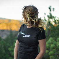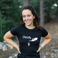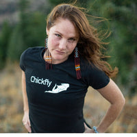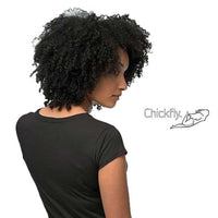 Fashionable and comfortable organic women's short-sleeved organic classic t-shirt gives you the right look and feel for everyday use so you can go anywhere with Chickfly. Black organic t-shirt with Chickfly logo in white.