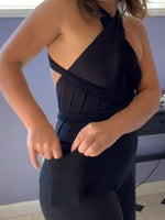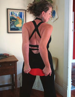 It has two long straps that can be worn in numerous ways; tied behind the neck, threaded through the bodice and tied in a bow, wrapped around the waist, crossed, or twisted. The bodice works great either bra-less or with a black bra chosen to match the style.