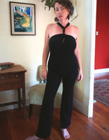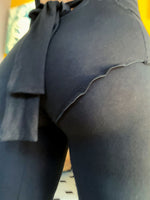 The fly has a serged edge (like the merino leggings) with a slight wave that gives it a hint of a ruffle along the bum. It does not have added elastic like the original bamboo pants and leggings, and thus it is looser. This jumpsuit's pant legs are straight and fit perfectly over your favorite pair of fashionable boots or high heels.
