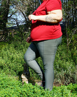 Their waistband is medium-high with two secret pockets and can be folded over for a low-rise waistband look too. They have two deep thigh pockets as well, great for keeping your phone. Designed with no actual zip fly but with a well-designed and comfortable pull apart fly that opens and closes quickly and easily. These leggings were handcrafted in Oakland California in a small batch. Made by women for women. Giving you the freedom to go anywhere with a fly that works for every body.