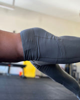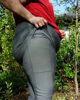 Our patented fly is held together by tension, creating a seamless, flattering, soft, and easy-to-use feature in the most comfortable and stylish stonewall grey durable legging. This fly differs from that in our original leggings in that it is long like a short-shorts and the finished seam is surged without added elastic for a looser, casual fit.